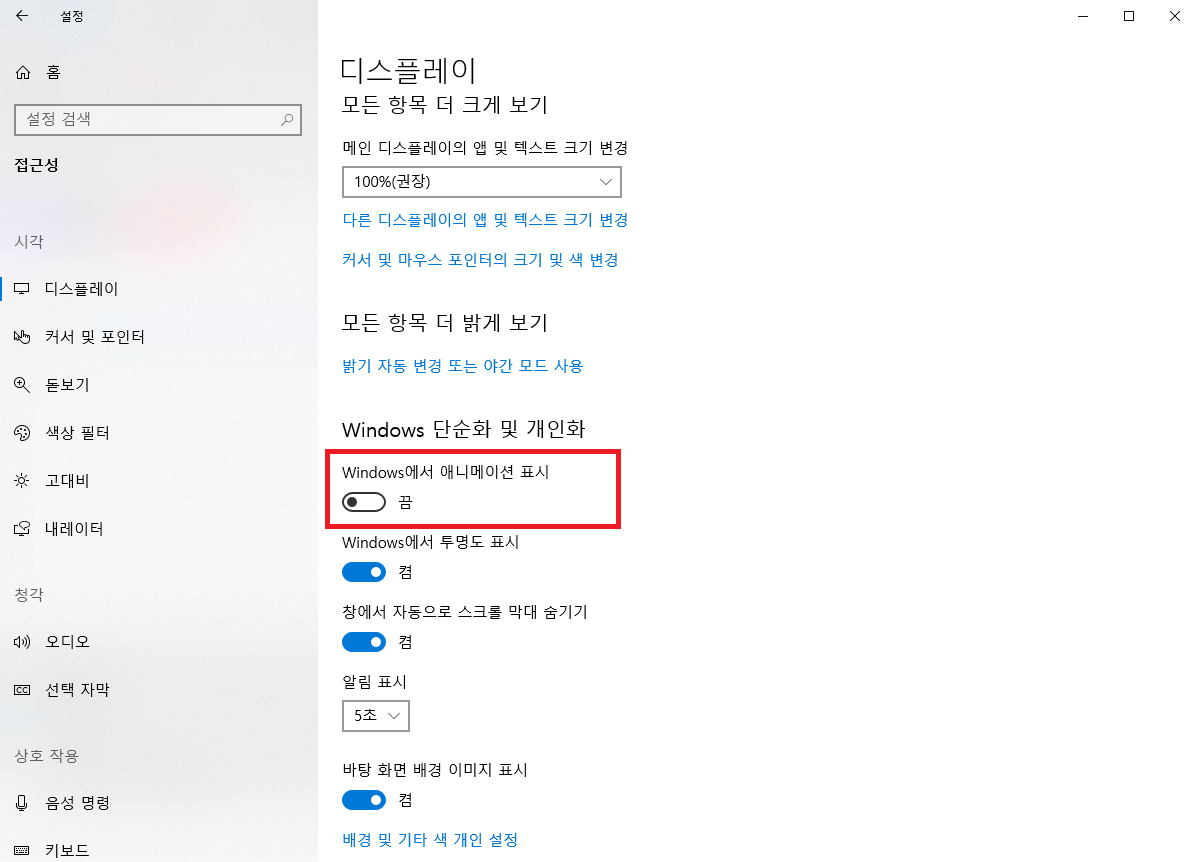 윈도우 > 설정 > 접근성 > Windows에서 애니메이션 표시 끔으로 설정하면 신세계