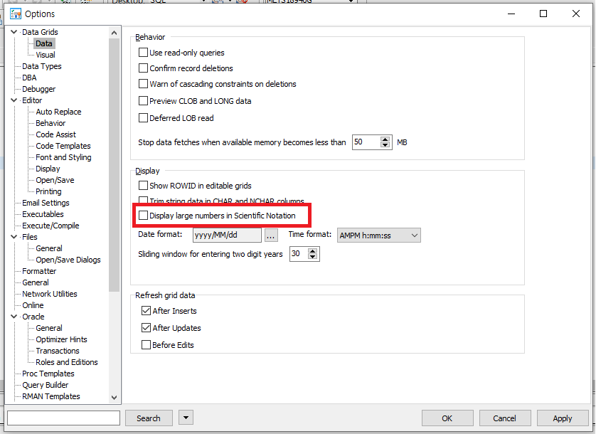 숫자 온전히 확인하고 싶다면 Toad 의 설정을 변경한다.