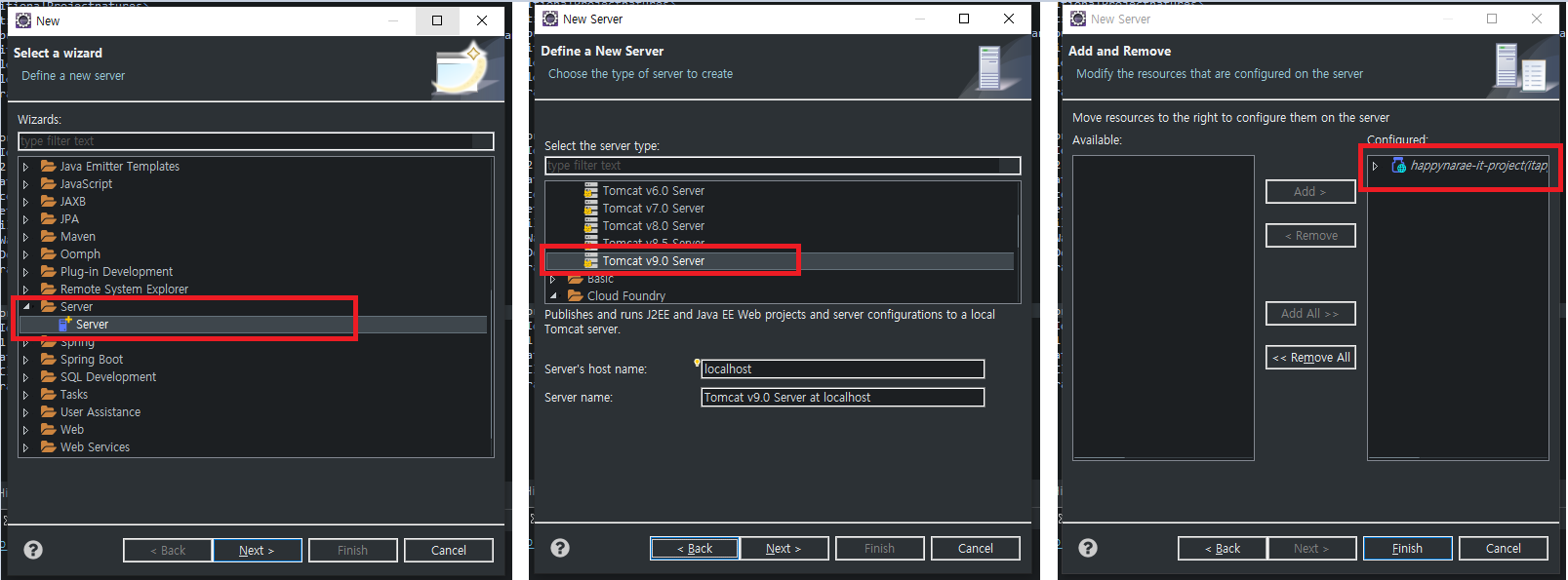 File > New > Server 에서 Tomcat 생성 및 프로젝트 추가