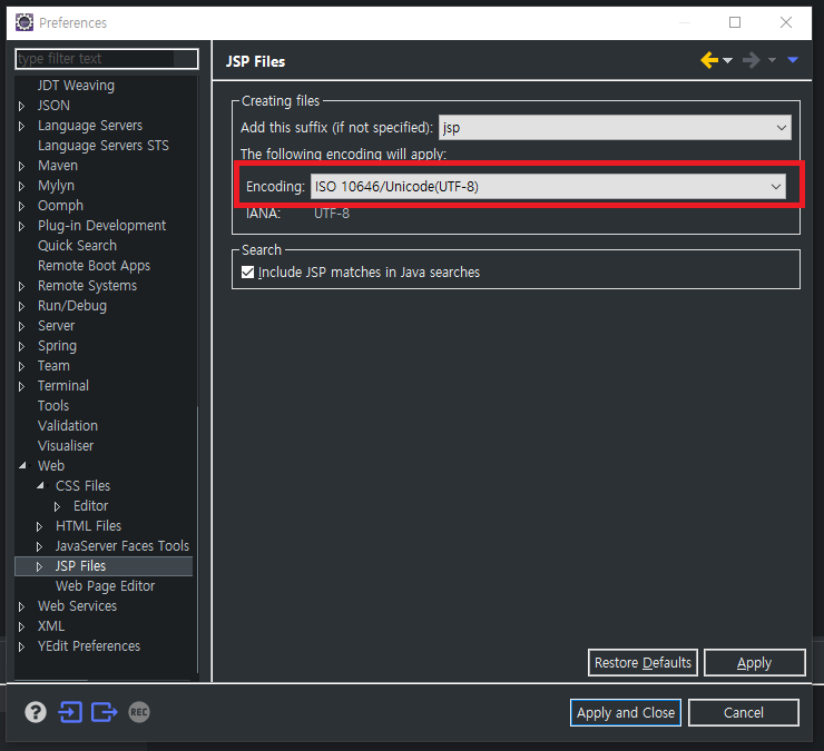Window > Preferences > General > WEB CSS, HTML, JSP 파일 인코딩도 변경한다.