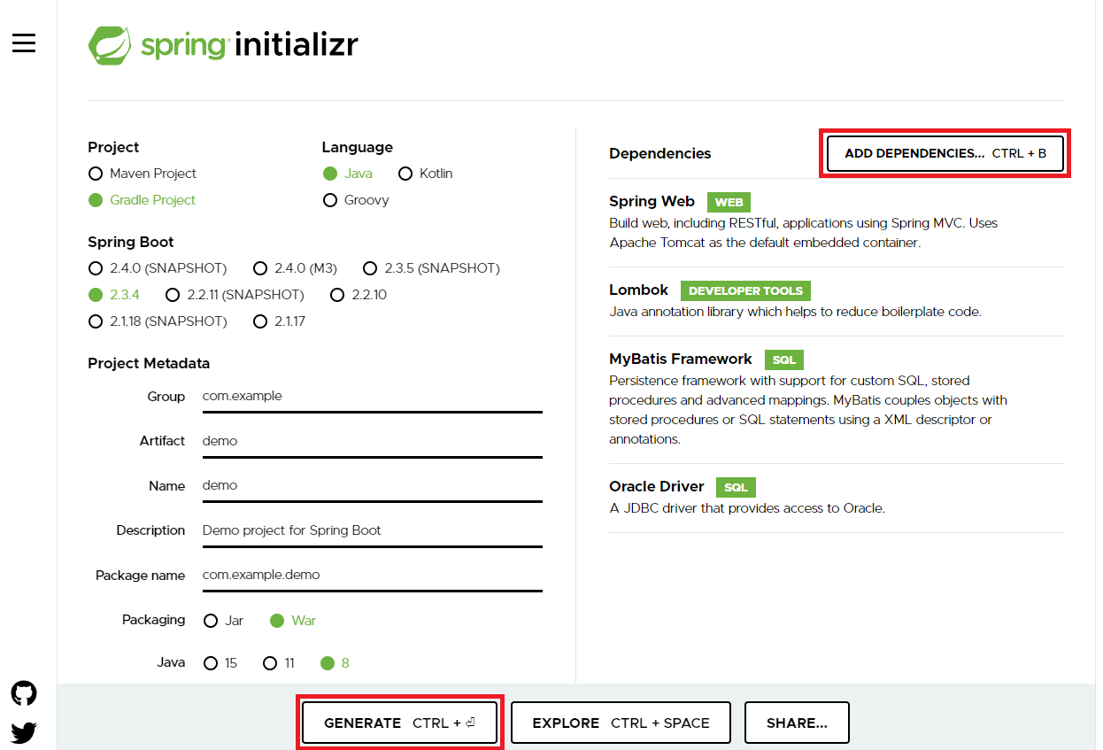 - Dependencies : Spring Web, Lombok, Mybatis, Ojdbc8, JSTL, SiteMesh