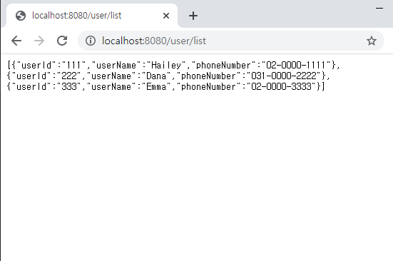 서버 실행 후 컨트롤러에 작성한 경로로 접속하면 원하는 데이터가 받아와 지는 것을 확인할 수 있다.