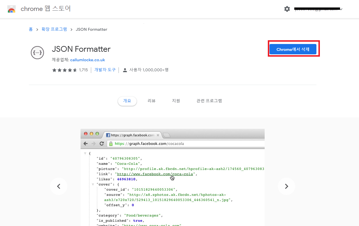 - URL 접속 및 설치: https://chrome.google.com/webstore/detail/json-formatter/bcjindcccaagfpapjjmafapmmgkkhgoa?hl=ko&