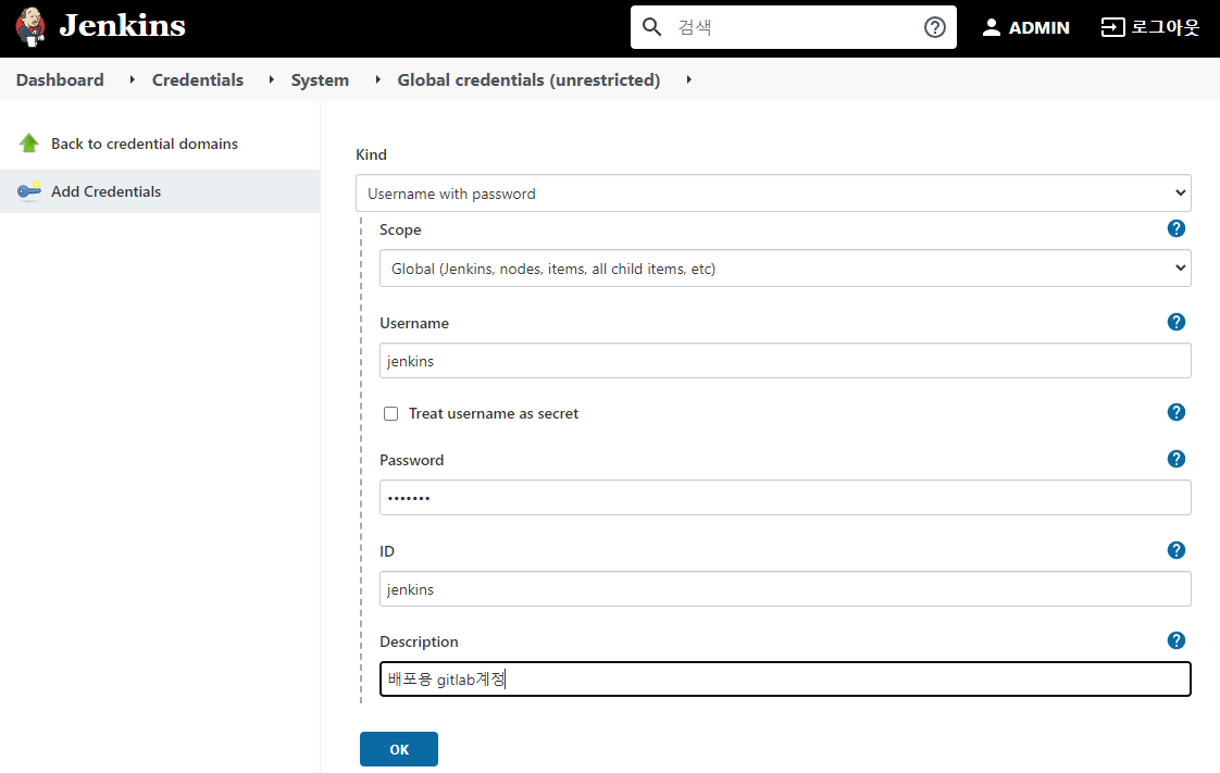 메뉴: Jenkins > Credentials > System > Global credentials > Add Credentials