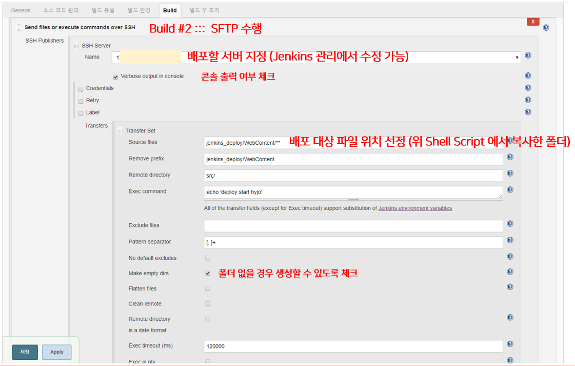 접속 정보가 미리 저장된 Server에 jenkins_deploy/ 하위 소스들을 전송한다.