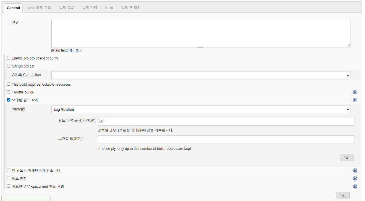 빌드 이력을 얼마나 가지고 있을지 설정한다. 작은 프로젝트의 경우 설정하지 않아도 무방하지만, 일반적으로 지정하고 넘어가 준다.