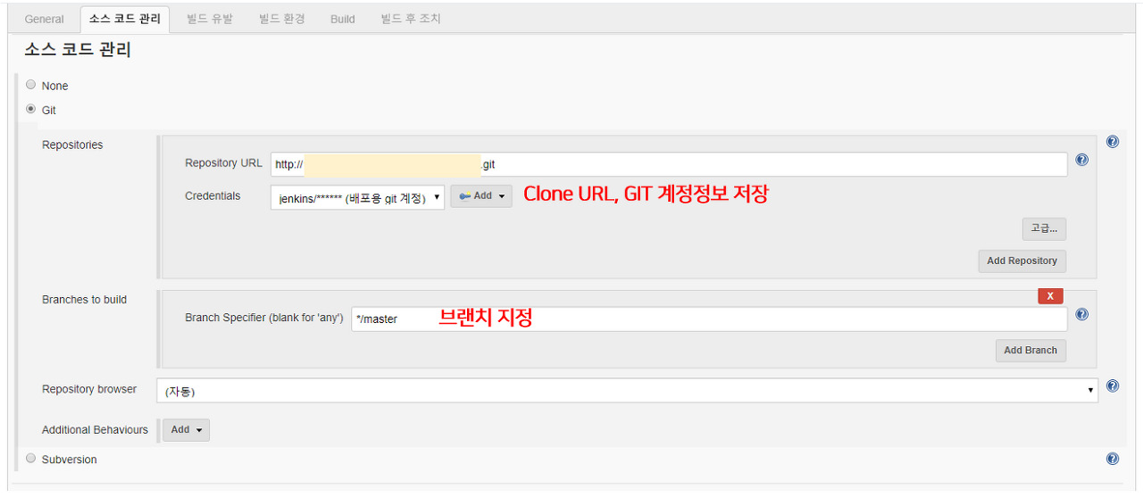 Credentials에는 이전 초기 환경설정에서 추가해뒀던 Jenkins배포용 GitLab 계정을 지정한다.