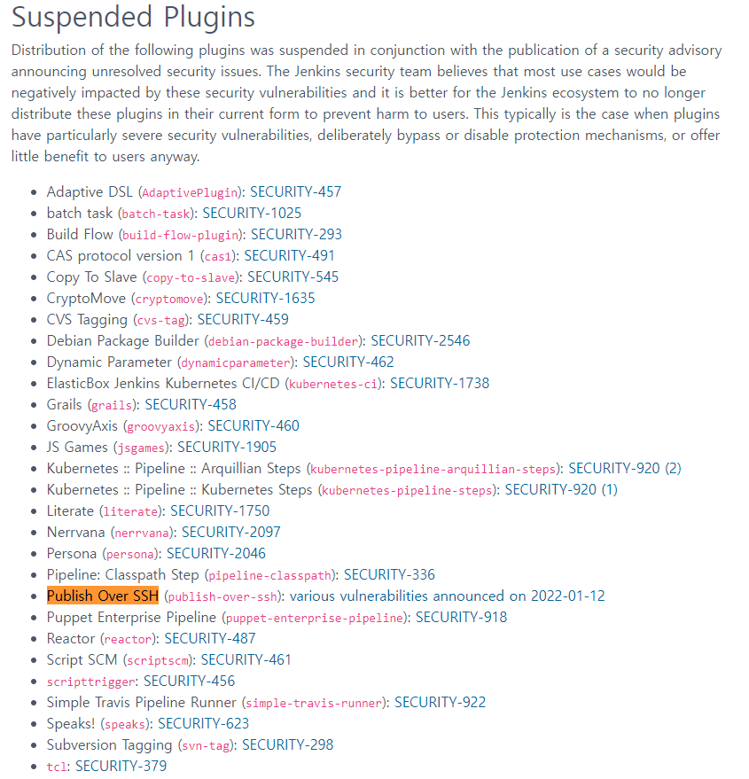 안내된 페이지(https://www.jenkins.io/security/plugins/#suspensions) 로 들어가 보면..