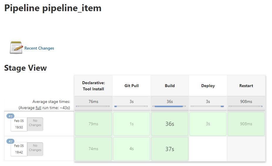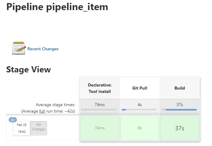 Stage View로 어느 스테이지가 몇초만에 실행되었는지를 확인할 수 있다. Build History를 보면 ‘Hello World’ 가 출력된 것도 확인할 수 있다.