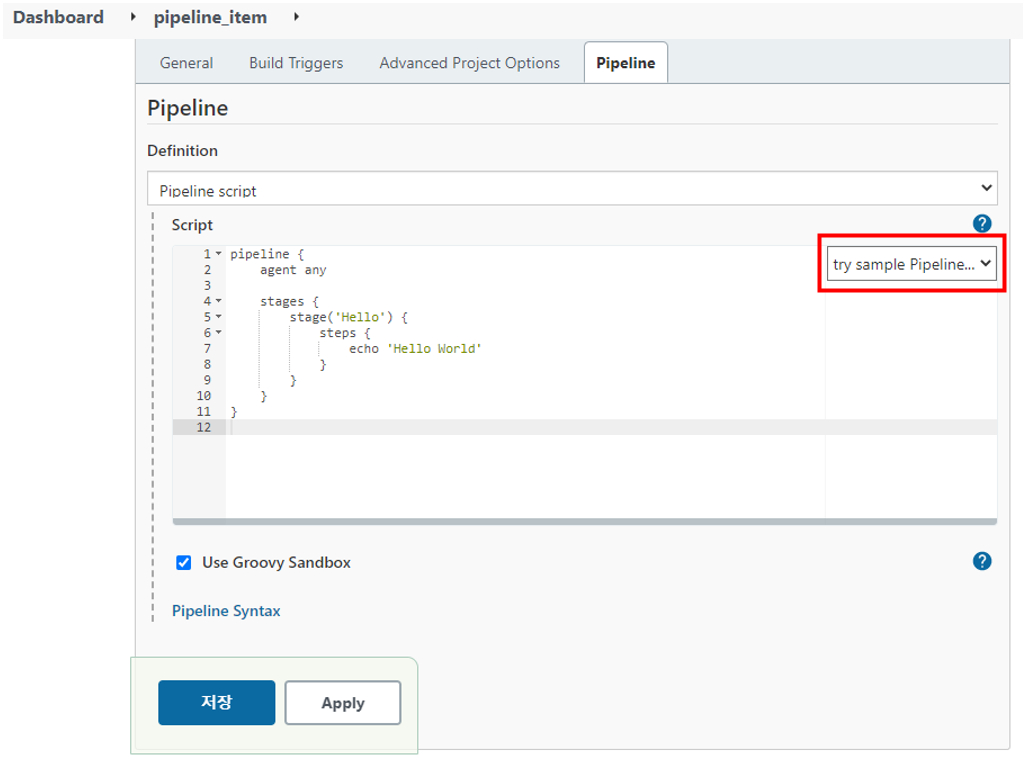 try sample Pipeline > Hello World 를 선택해서 확인해 보자.