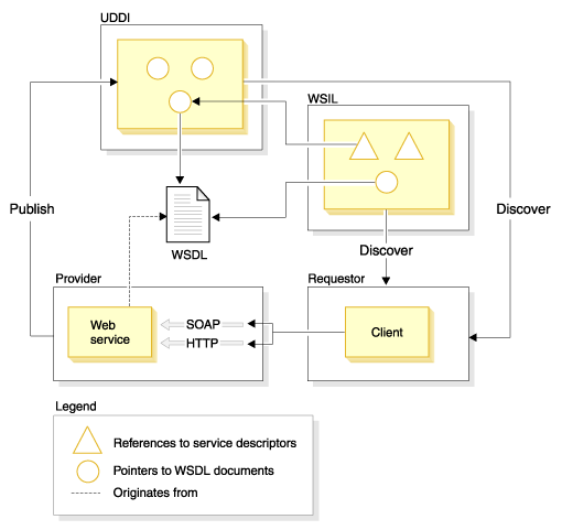 - 서비스 제공자는 웹 서비스를 호스트 하여 SOAP/HTTP 또는 SOAP/JMS와 같은 프로토콜을 사용하여 액세스 할 수 있게 한다. 웹 서비스는 제공자의 서버 또는 특수 저장소에 저장된 WSDL 문서로 설명한다. UDDI 비즈니스 레지스트리 및 WSIL 문서가 WSDL 문서를 참조할 수 있는데, 여기에는 웹 서비스의 WSDL 파일에 대한 포인터가 포함되어 있다.